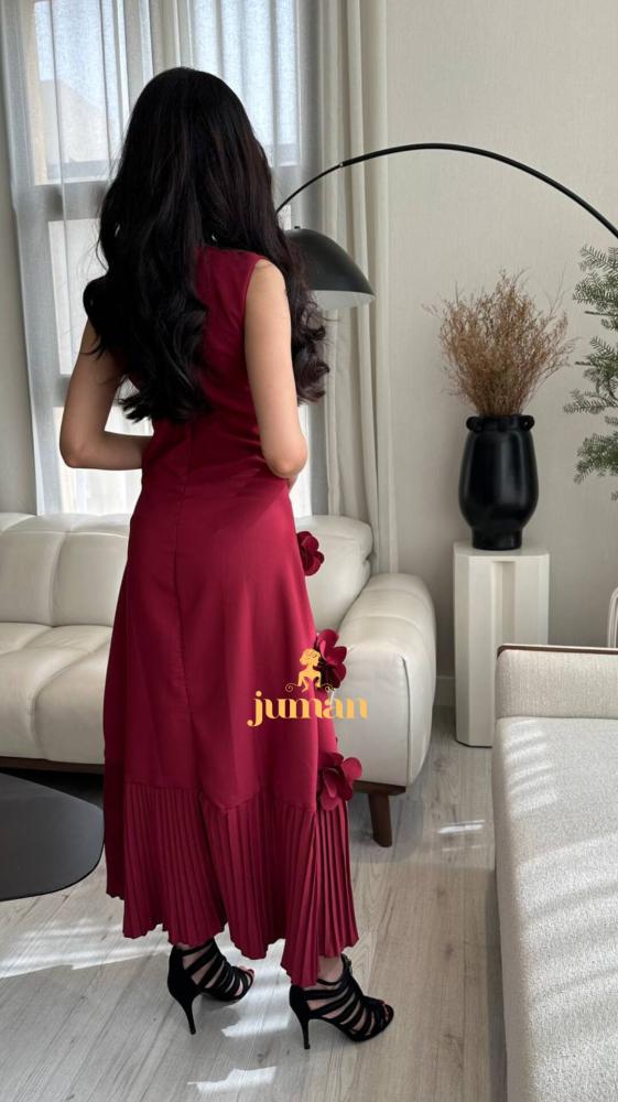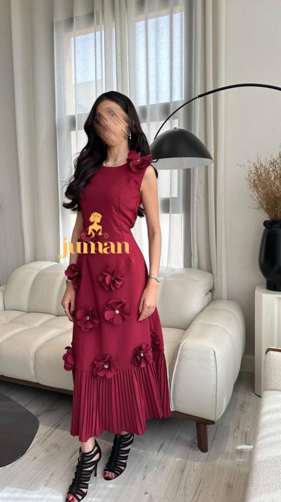 - فستان احمر سهرة الأحمر الأنيق مزين بنقشة ورود جذابة تضيف لمسة من الرومانسية والجمال، مما يجعله خيارًا مثالياً لإطلالة العيد المميزة.
