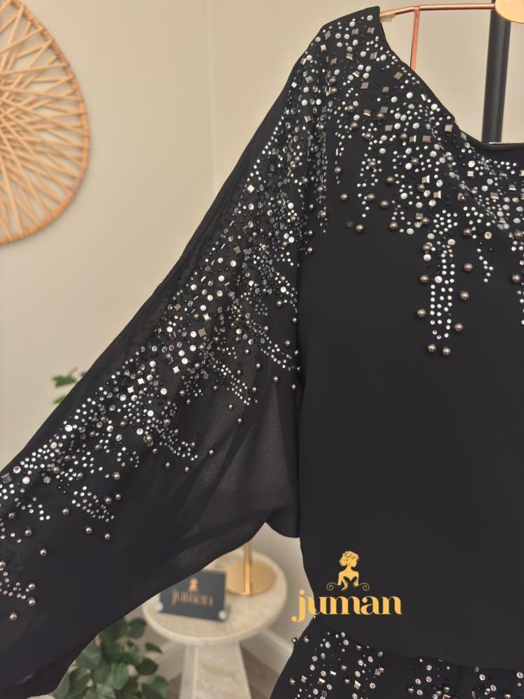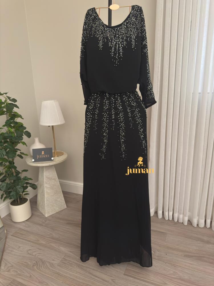 فستان اسود ساتر مصنوع من خامة الشيفون الراقية التي تجمع بين الأناقة والراحة مع أكمام طويلة ورقبة دائرية وتزين ترتر لامع يضفي لمسة من السحر والتميز ويمنحك مظهرا رائعا في كل مناسبة مع جودة عالية تدوم طويلا وسهولة في العناية تناسب جميع الأوقات