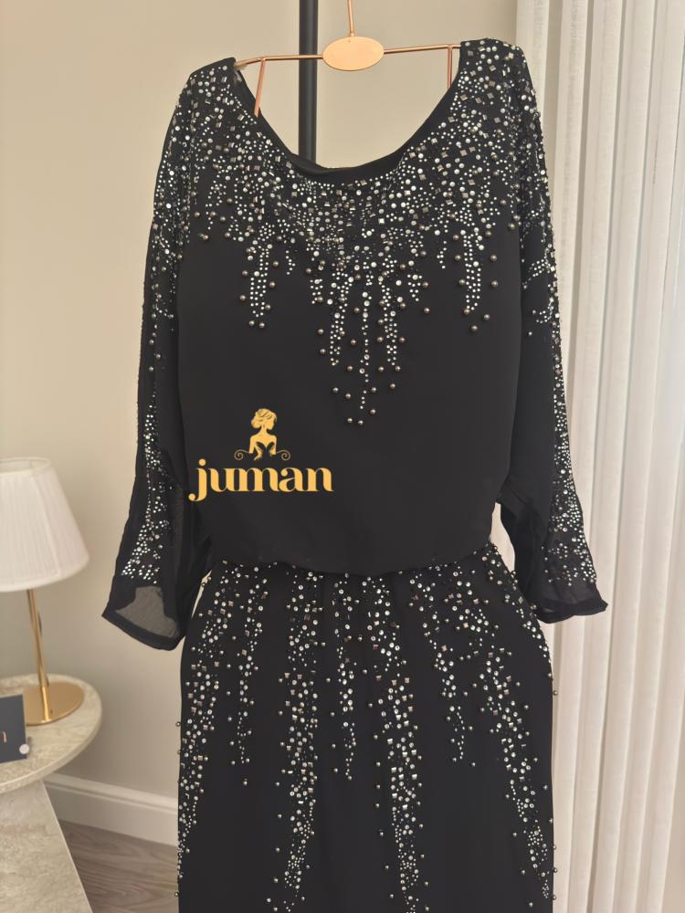 • فستان اسود ساتر يحتوي على تزيين ترتر لامع يضفي بريقا أنيقا يبرز إطلالتك في المناسبات الخاصة والسهرات